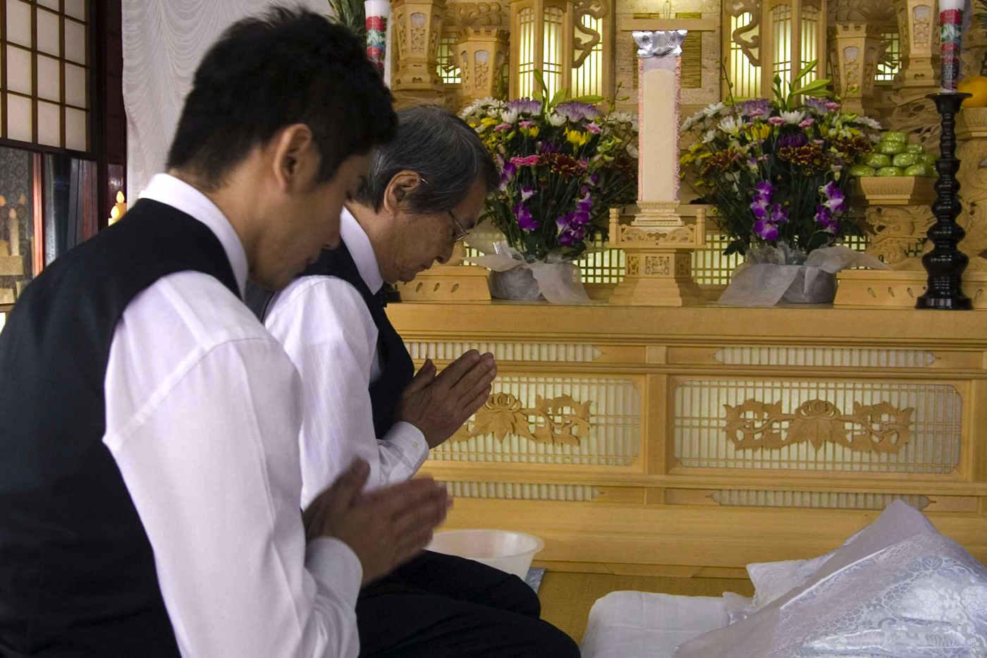 Before he has time to absorb this idea, Daigo is taken along by his new boss to observe the process. It strikes me as more humane than the Western practice of out of sight embalming and so on. The body of the departed is displayed on a mat in front of the mourners, who kneel together and watch the process of preparation. It is a ceremony of precise ritual and grace. Carefully arranged sheets preserve the dead person’s privacy as the corpse is washed and dressed. Then the face is made up with exquisite attention to detail. Finally the body is placed in a simple wooden coffin. Most family members remain silent, but sometimes there are outbursts of emotion — or truth — and young Daigo starts learning lessons of life.
