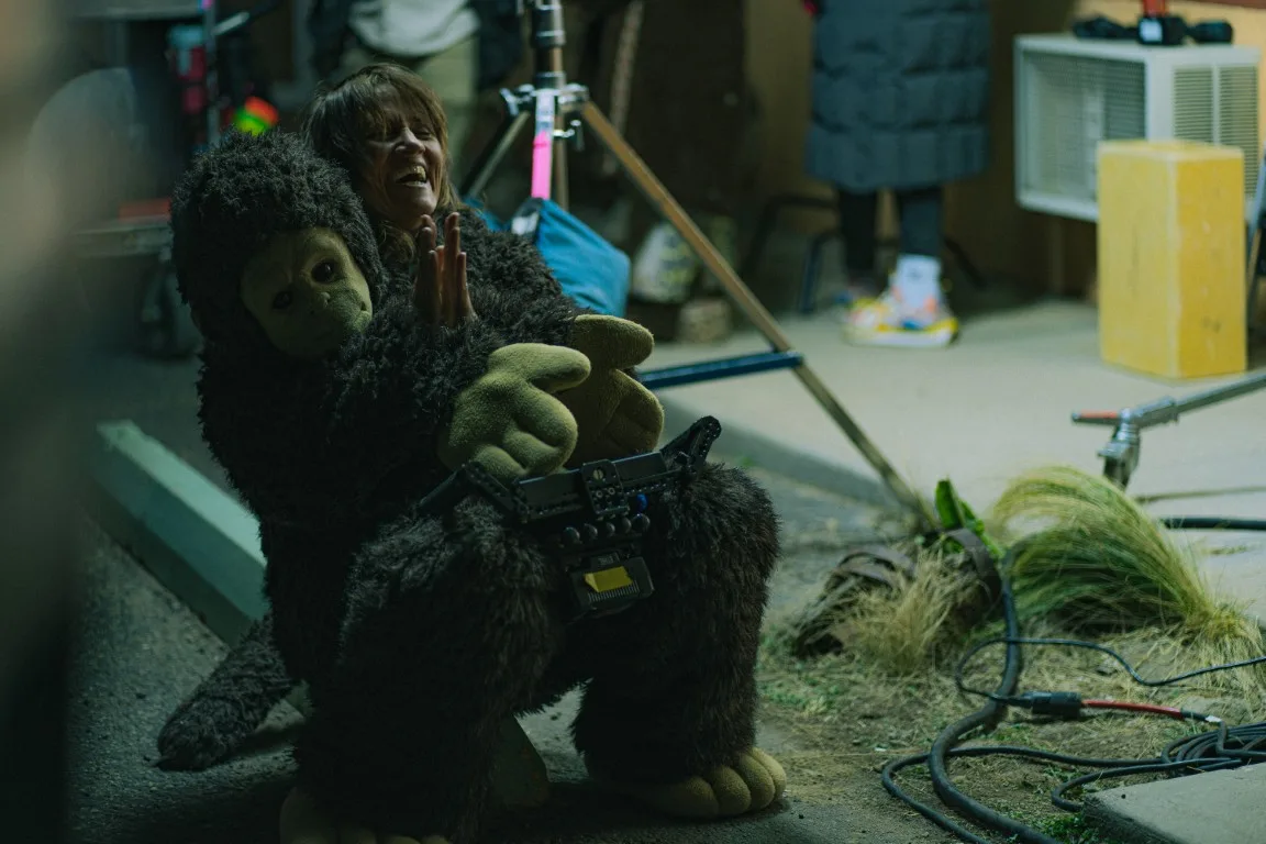 NC: It seemed like the way to disappear fully. She’s stayed in it longer and longer. Her commitment to the monkey has become somewhat superstitious at that point, because she prefers it to herself. But then she’s kind of passed the point of no return. And it was also…a very handy way to shoot the car crash with a low budget.
